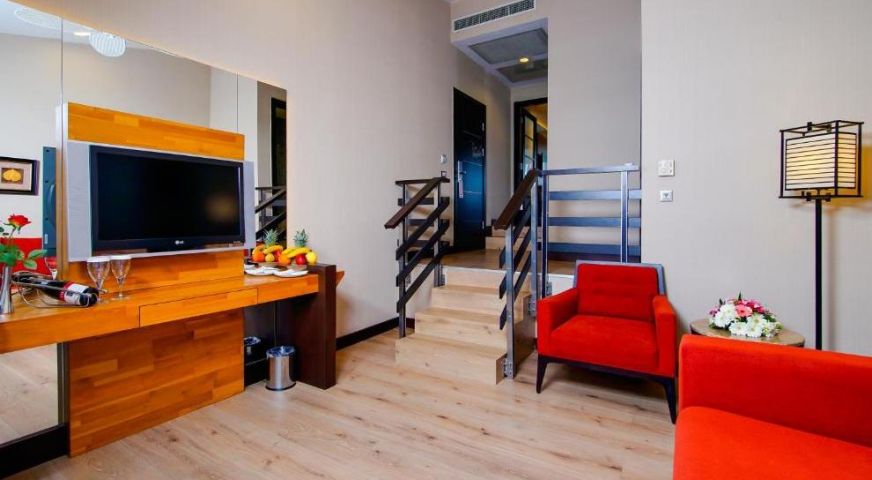 Хотелът се състои от една 8-етажна сграда, в която са разпределени 442 климатизирани стаи. Те са обзаведени с модерни мебели с турски елементи. Разполагат с просторна дневна зона с плоскоекранен телевизор, а някои имат и хидромасажна вана и тераса с гледка към морето.