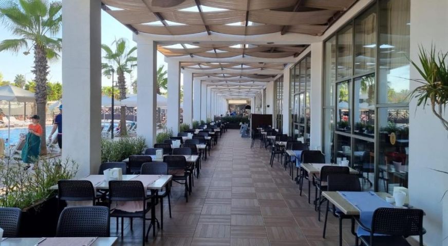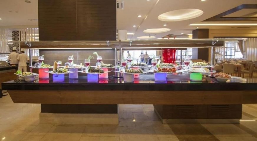 На територията на хотела: основен бюфет ресторант, 2 а-ла-карт ресторанта ( турски и рибен ресторант), снек бар, лоби бар, бар на плажа, сладкарница, 2 открити басейна, 1 закрит басейн, детски басейн, 3 водни пързалки, анимация, СПА център, фитнес център, билярд, дискотека, мини клуб, тенис на маса, конферетна зала, WiFI срещу заплащане.