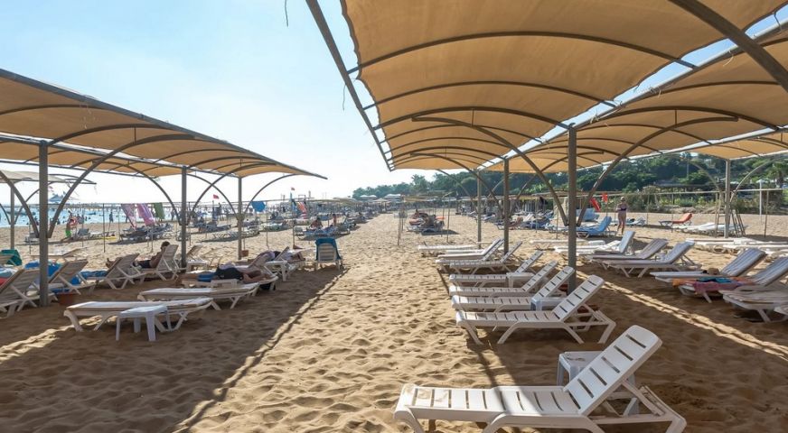 Плаж: собствен, на 550м, пясъчен. Чадържи, шезлонги, плажни кърпи при басейна и на плажа - безплатно