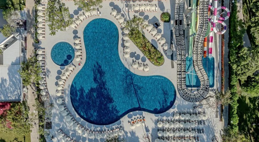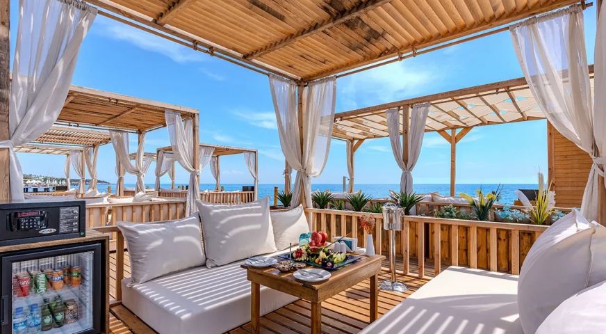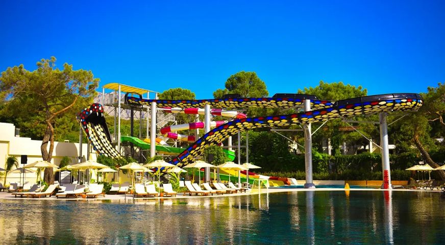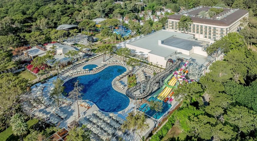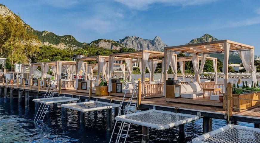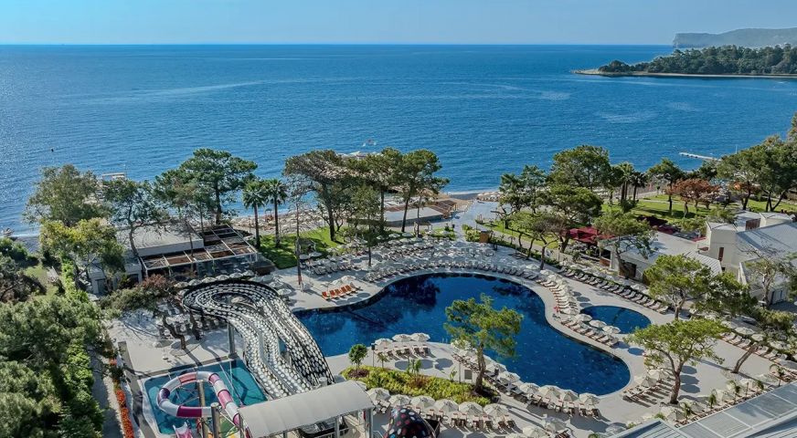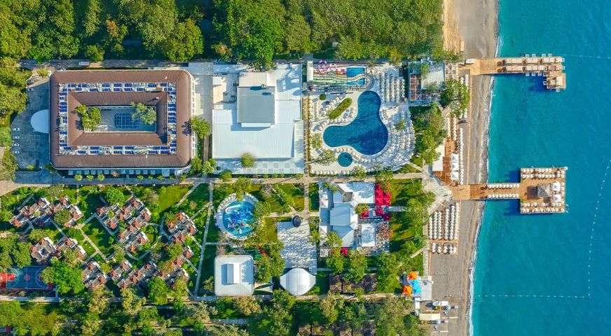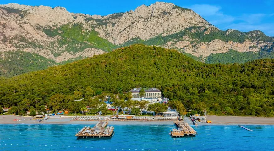 Намира се на 52 км от летище Анталия, на 45 км от центъра на Анталия, на 5 км от центъра на Кемер, на брега на морето. Изцяло реновиран през 2024 г., на обща площ от 60 000 м2.