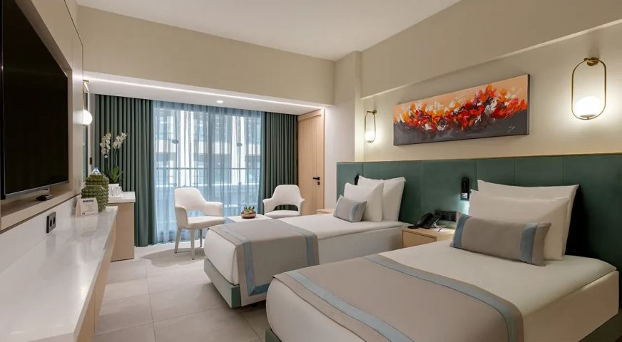 Стаи Main Building - Atrium room (изглед градина - 33 м2); Deluxe room (изглед градина, планина или море – 36 м2), Deluxe Superior room (спалня, единично и допълнитлено легло, изглед градина, планина или море,– 38 м2), Deluxe Superior Family (две помещения, спалня и две единични легла, две бани, 2 балкона, изглед градина или планина – 71 м2), Deluxe room (изглед градина или планина – 36 м2), Deluxe Family (две помещения, спалня и двуетажно легло, две бани, изглед градина – 58 м2).