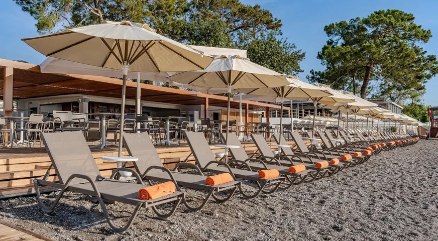 Собствен, пясъчно – чакълест, притежаващ сертификат „Син флаг“, с дължина на плажната ивица 200м. Чадъри, шезлонги и плажни кърпи на плажа и при басейна – безплатно.