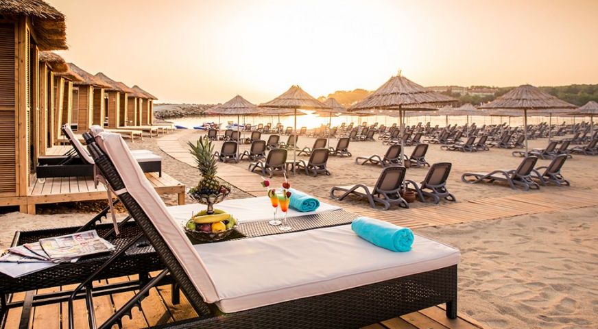 Собствен, пясък. Бар на плажа - безплатно. На басейна и на плажа: чадъри, шезлонги, матраци - безплатно. Плажни кърпи - безплатно.