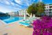 Плаж: Cобствен пясъчно-чакълест плаж, втора брегова линия. Има кей. На плажа чадъри, шезлонги, матраци, бар: безплатно. Кърпите са срещу депозит.