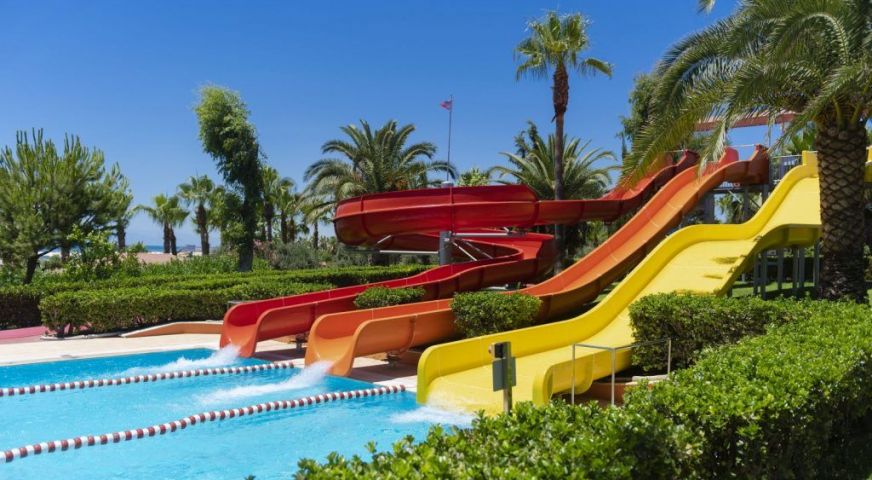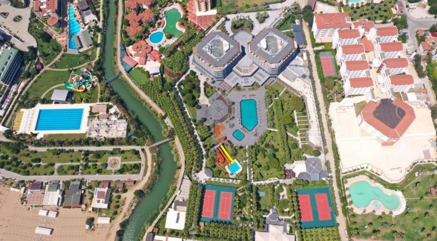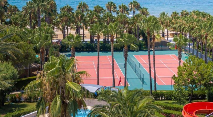 а, волейбол, зала за игри, тенис на маса, дартс, сауна, масажи, турска баня, детски клуб, различни магазини, тенис на корт, 1 басейн за възрастни и 1 за деца