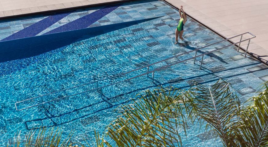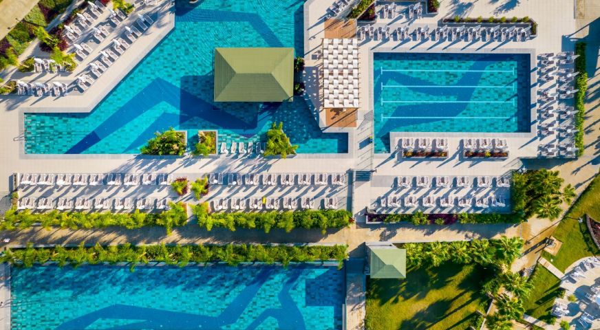 • 2 открити / 990 кв.м. и 770 кв.м. / и 1 закрит басейн за възрастни + 1 закрит детски басейн /