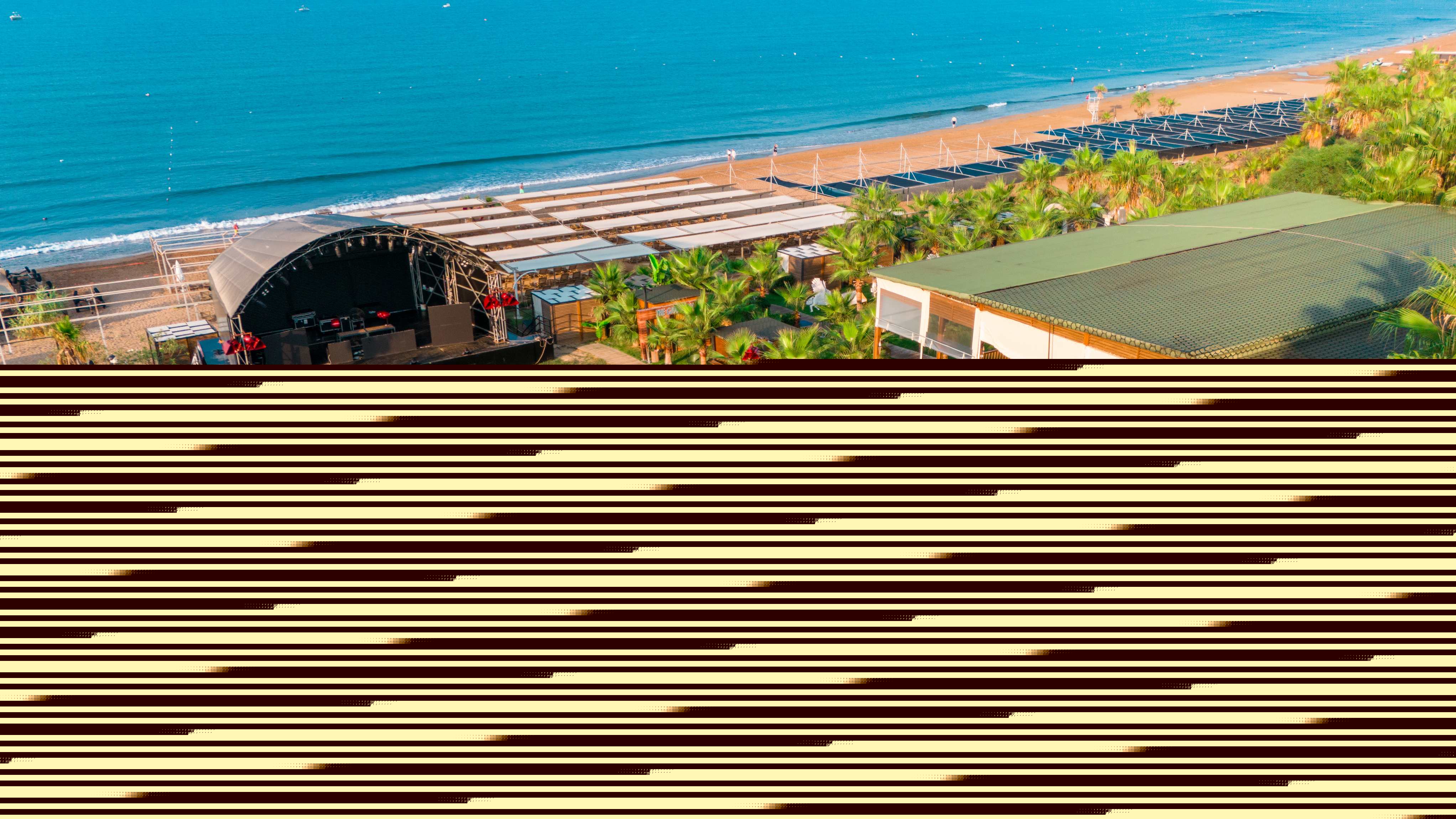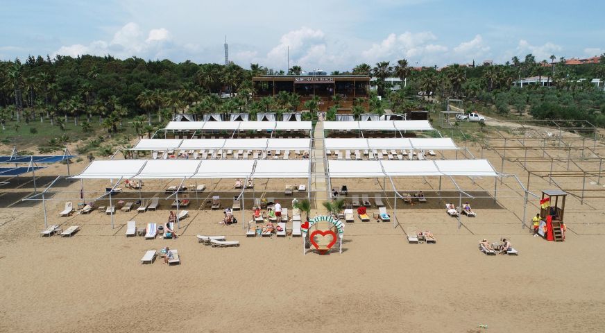 Собствен, на 500 м. от хотела, пясъчен. Безплатен шатъл до плажа (в определен часови диапазон). Чадъри и шезлонги на плажа и при басейна - безплатно. Плажни кърпи – срещу депозит.