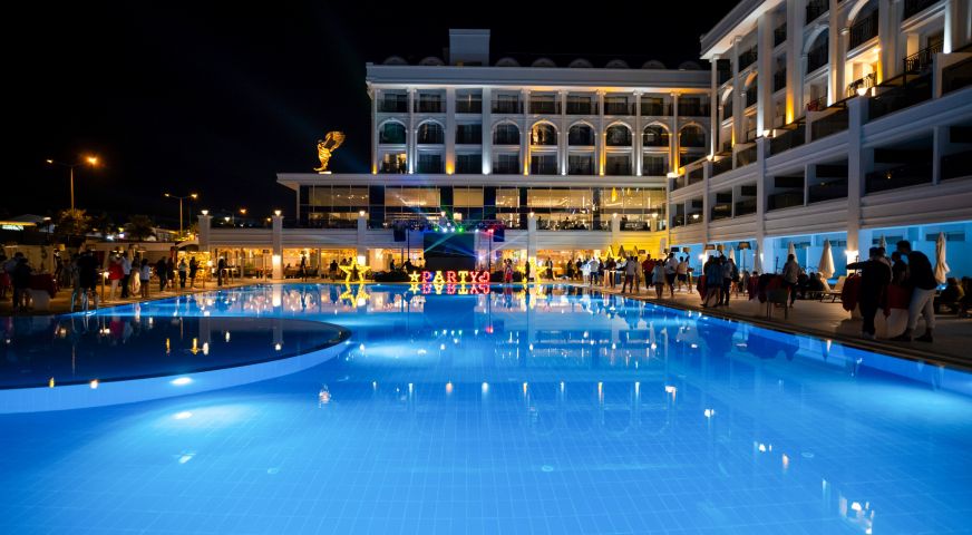 Основен ресторант, 4 а-ла-карт ресторанта - рибен, турски, италиански (1 безплатно посещение на 1 от ресторантите при минимум 7 нощувки), стек (срещу заплащане с предварителна резервация), сладкарница, Starbucks кафе, 6 бара, 2 открити и 1 закрит басейн, водни пързалки, СПА център, дискотека, магазини, конферентнa залa, паркинг.